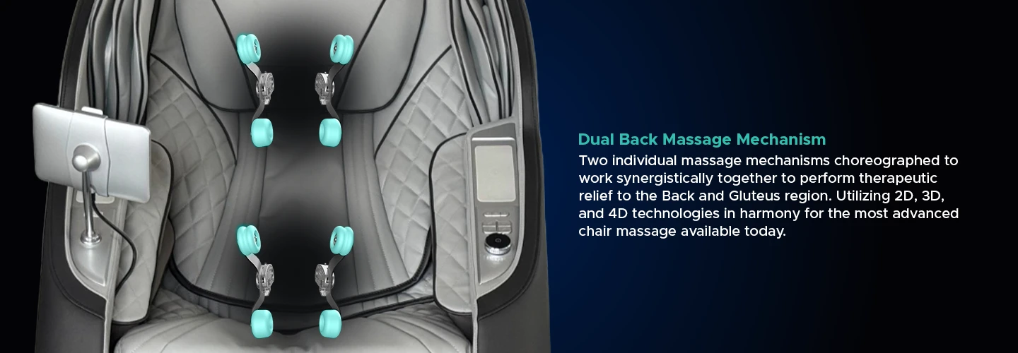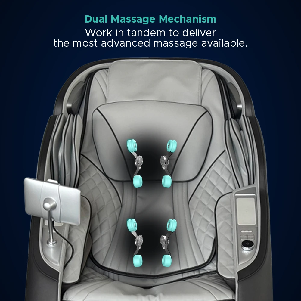 At the core of Sensation 4D DualFlex is a powerful 4D Dual Mechanism that synchronizes the movements of two massage therapists, delivering deep-tissue relief from neck to glutes with multidirectional motion and variable speed. Flex Track technology combines L-Track coverage with S-Track stretching for exceptional reach and decompression. The Near-Flat Reclining Decompression Stretch guides the body into a full-body stretch, stabilizing the hips while gently elongating the spine. Cutting-edge AI Technology adds unmatched customization via the robotic massage screen, letting users select techniques, adjust 4D intensity, control speed across four regions, and fine-tune air compression. Sessions can also be personalized using the 7" Touchscreen Tablet, Intelligent Voice Command, or Quick-Access panel, while Dual Reflexology Foot Rollers, lumbar and foot heat, Bluetooth® Speakers, and advanced air compression complete the experience.