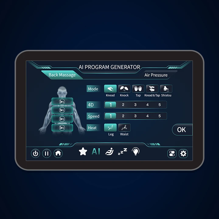 Your chair features advanced customization that delivers a real-time, personalized massage designed to relieve tension and stress. Through the Custom Program Generator, you can assign technique modes to four back zones—two upper zones for the top mechanism and two lower zones for the bottom—while adjusting 4D intensity and speed for the upper back mechanism and selecting airbag compression therapy under Air Pressure.
